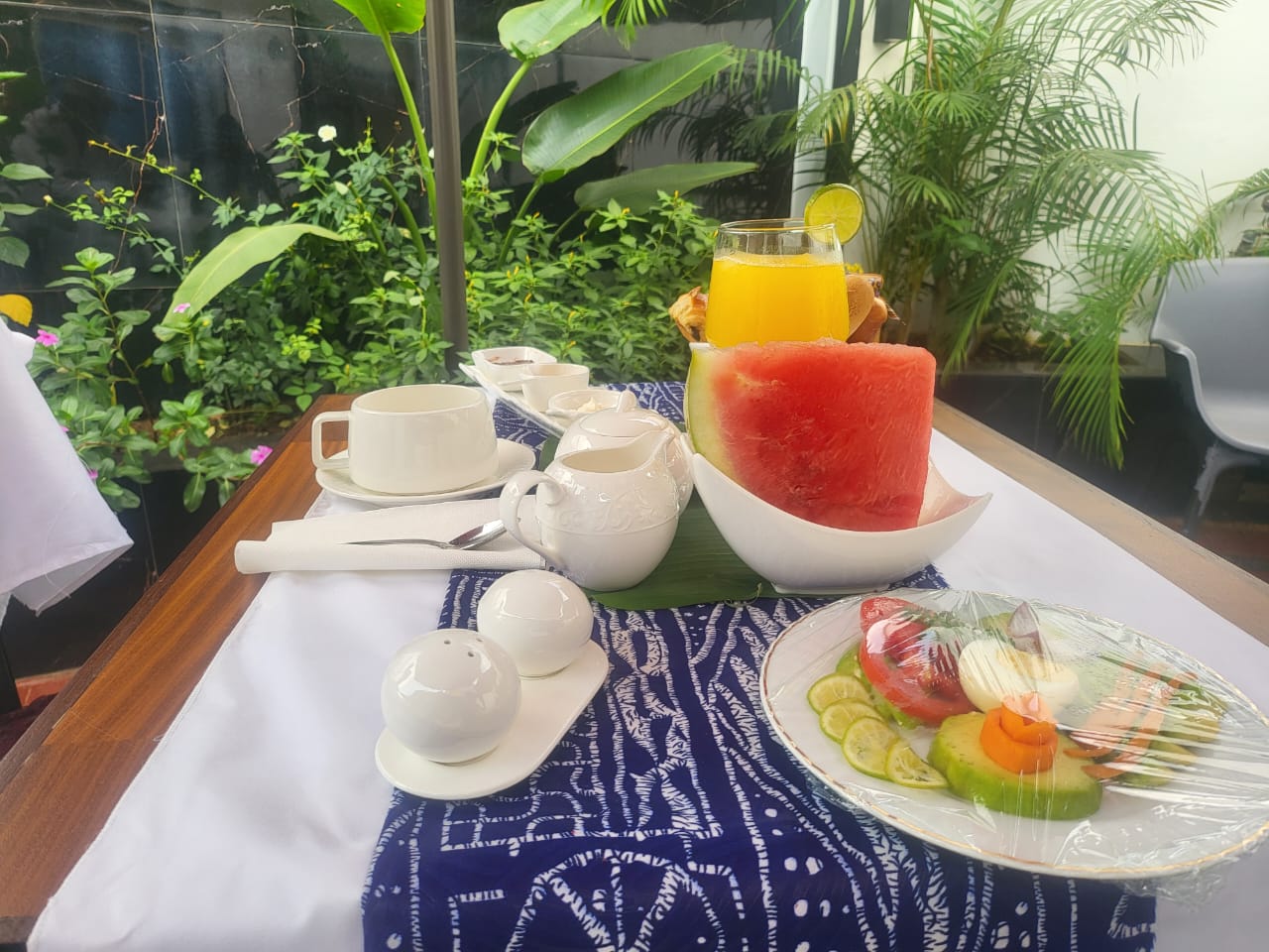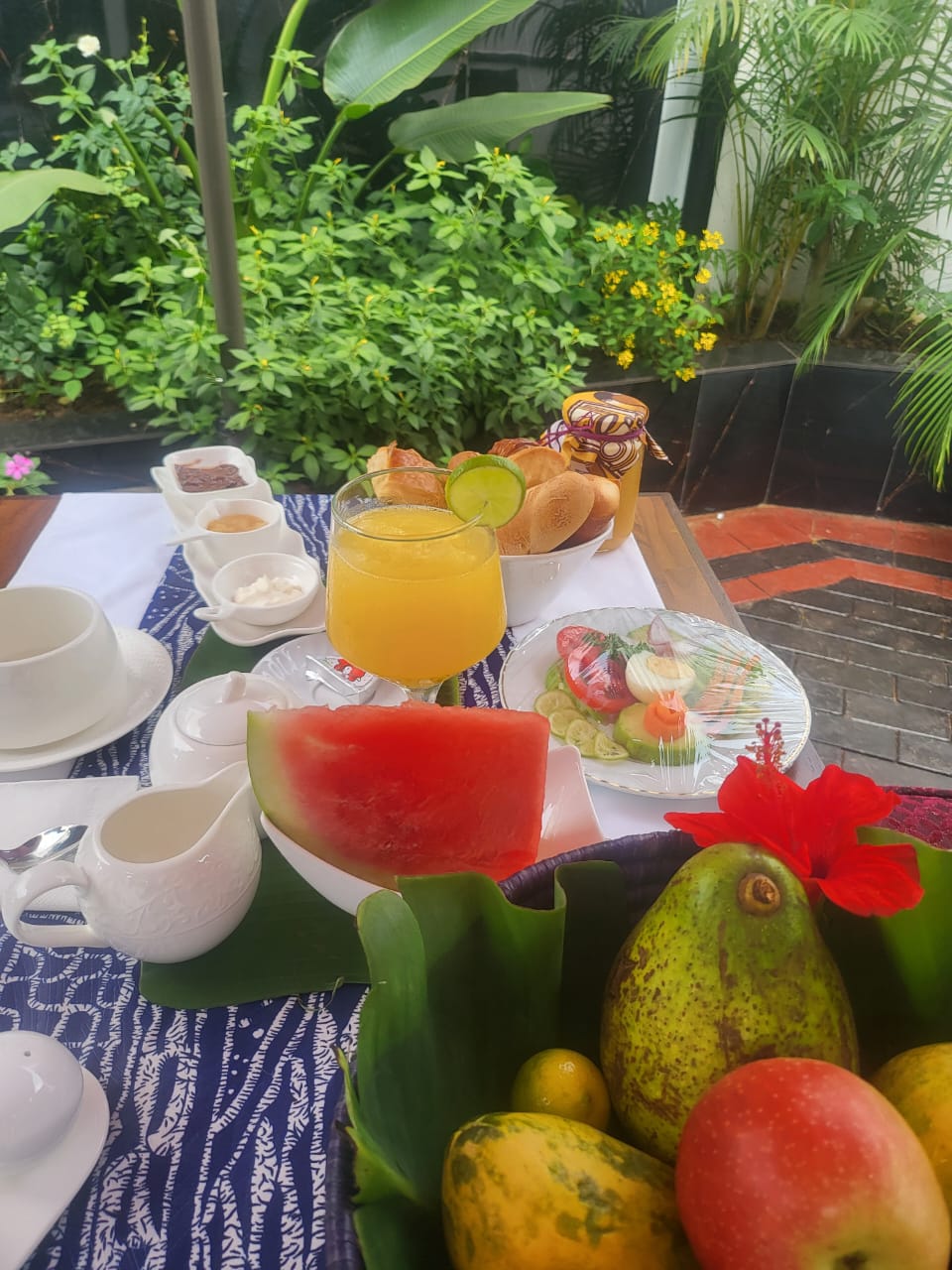 Le petit déjeuner est servi de 7h30 à 11h dans la salle de notre restaurant. Vous aurez le choix entre divers pains et viennoiseries, confitures, beignets, mets locaux… Le tout, à déguster en intérieur ou en extérieur, selon vos envies.